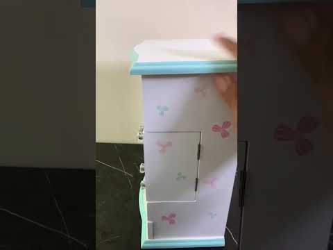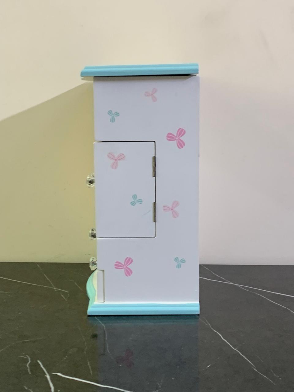 - A hinged top lid that opens to reveal a mirror and a doll on the underside.