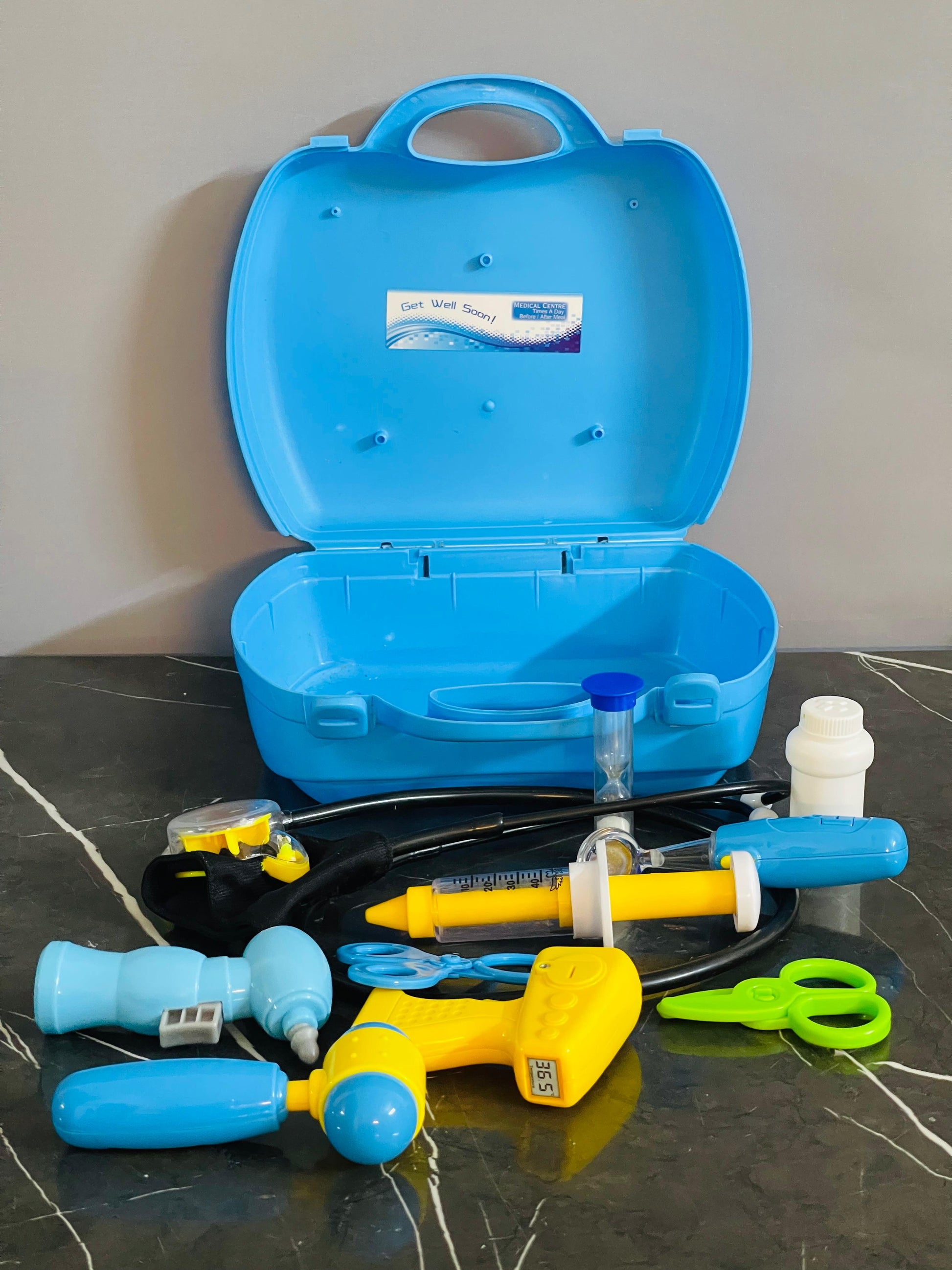 - The set includes various toy medical equipment like a stethoscope, syringe, and other accessories.