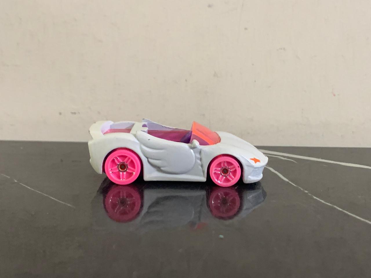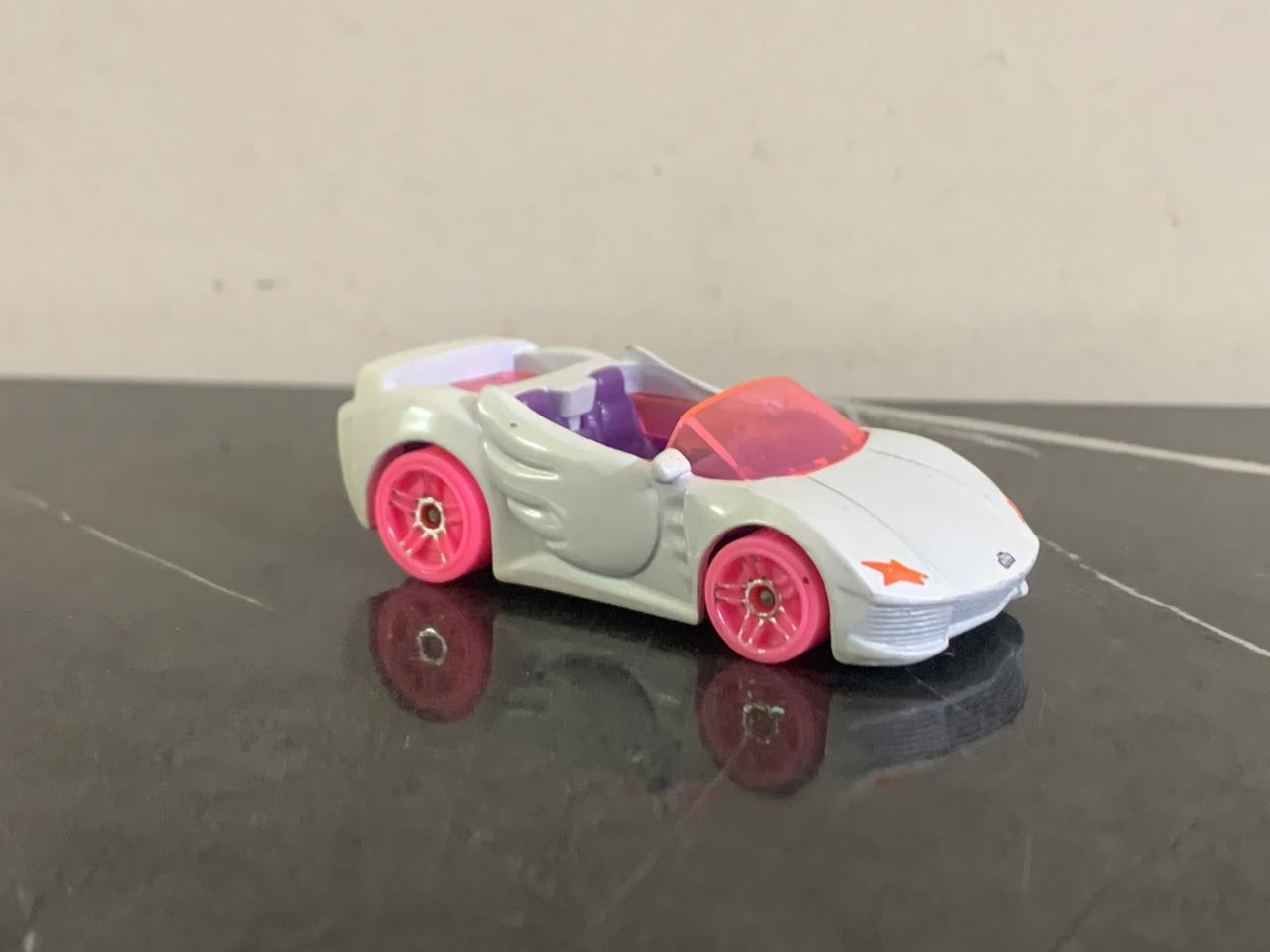 - Features a white exterior with a bright pink interior and orange headlight details.