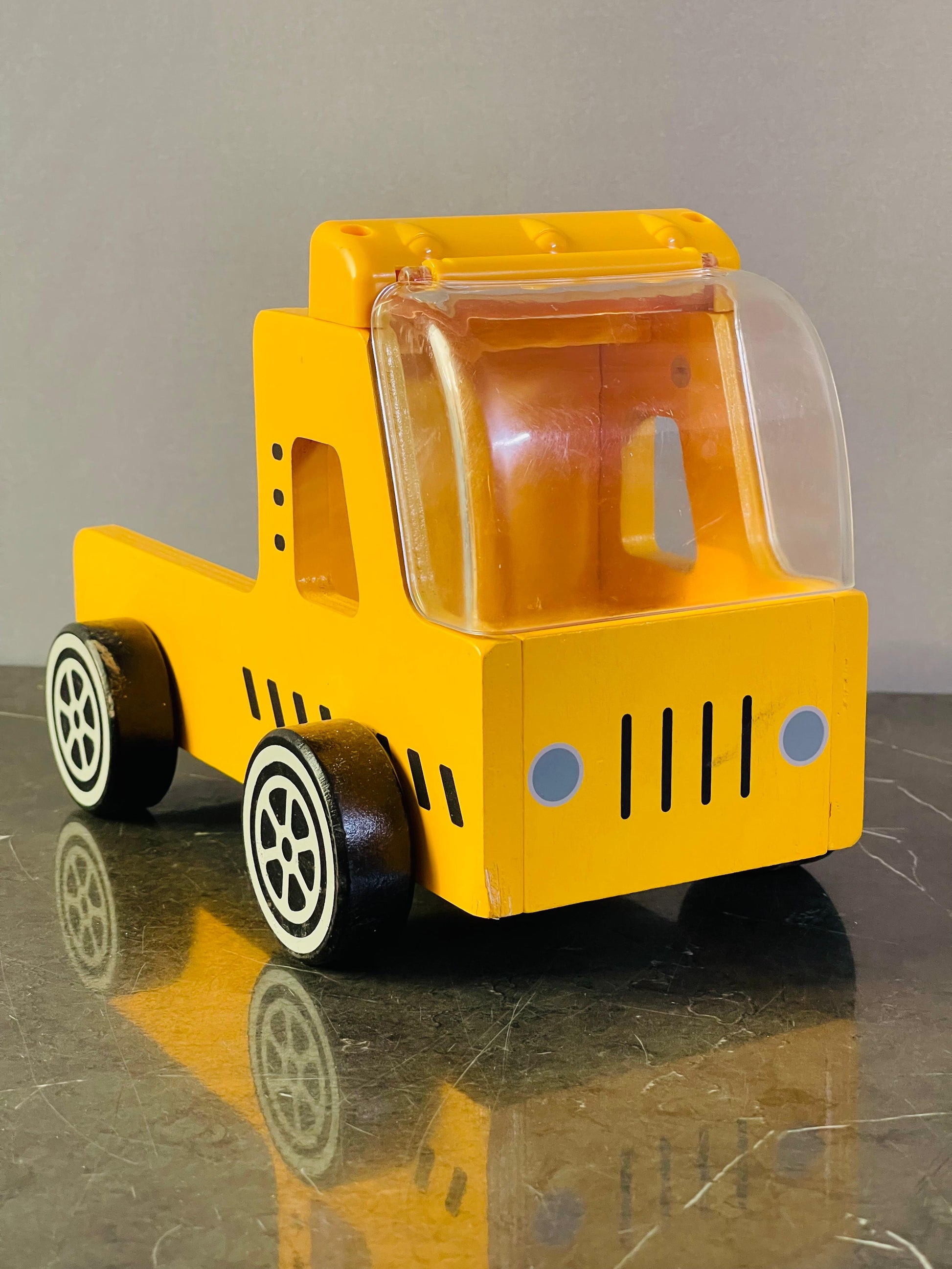 - Beautifully crafted wooden dump truck toy.