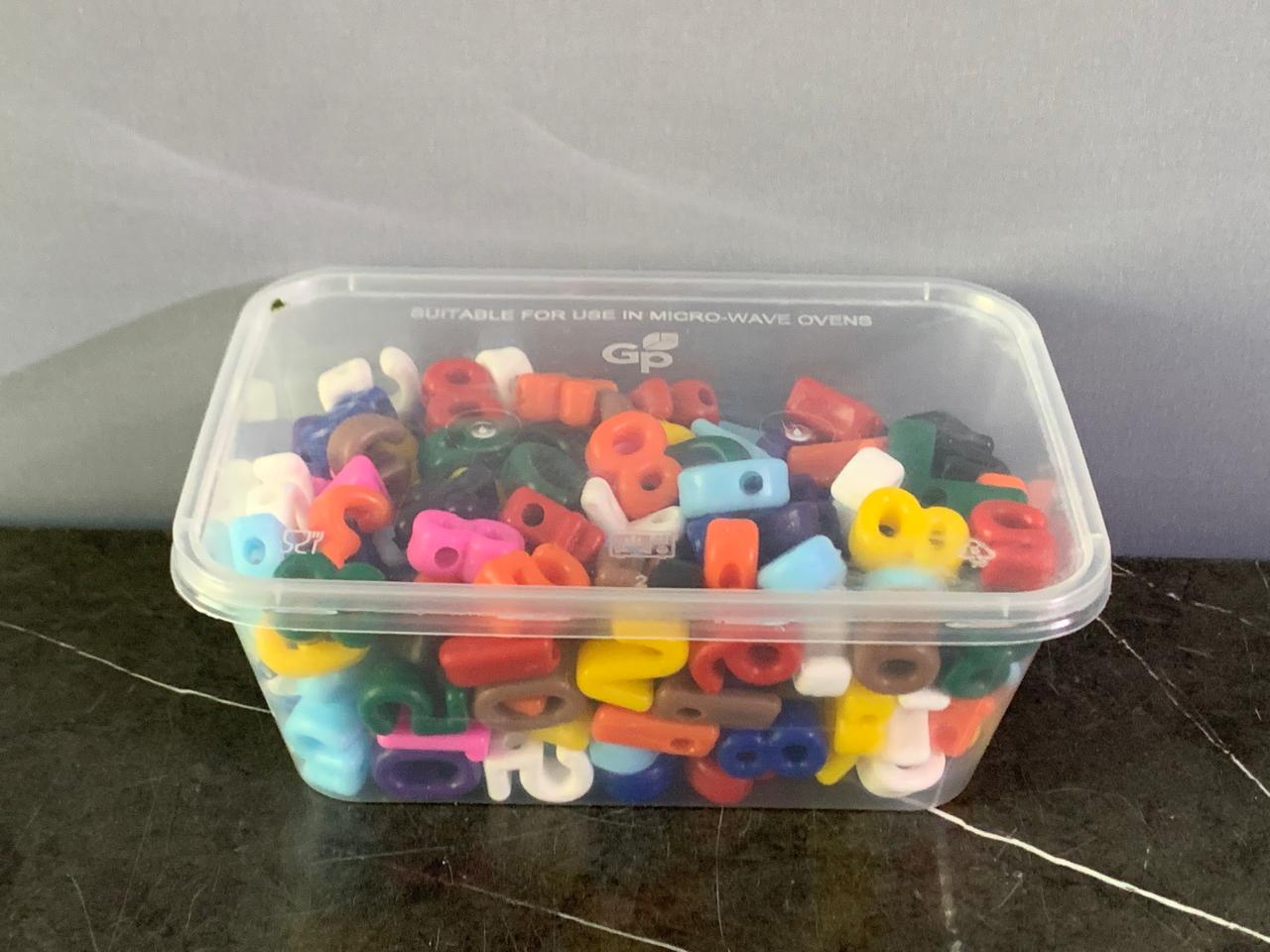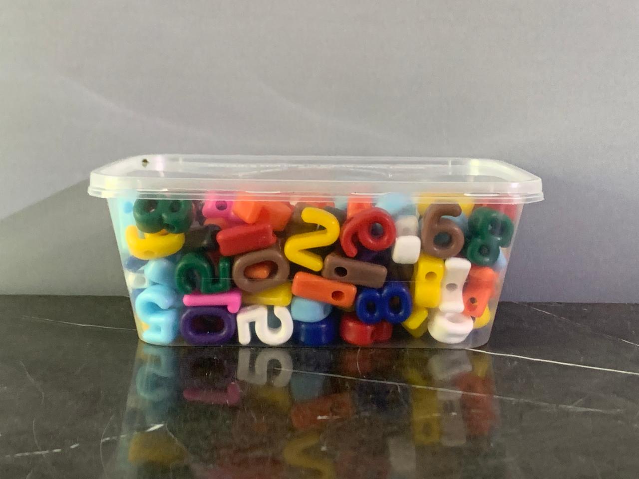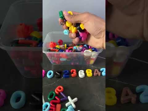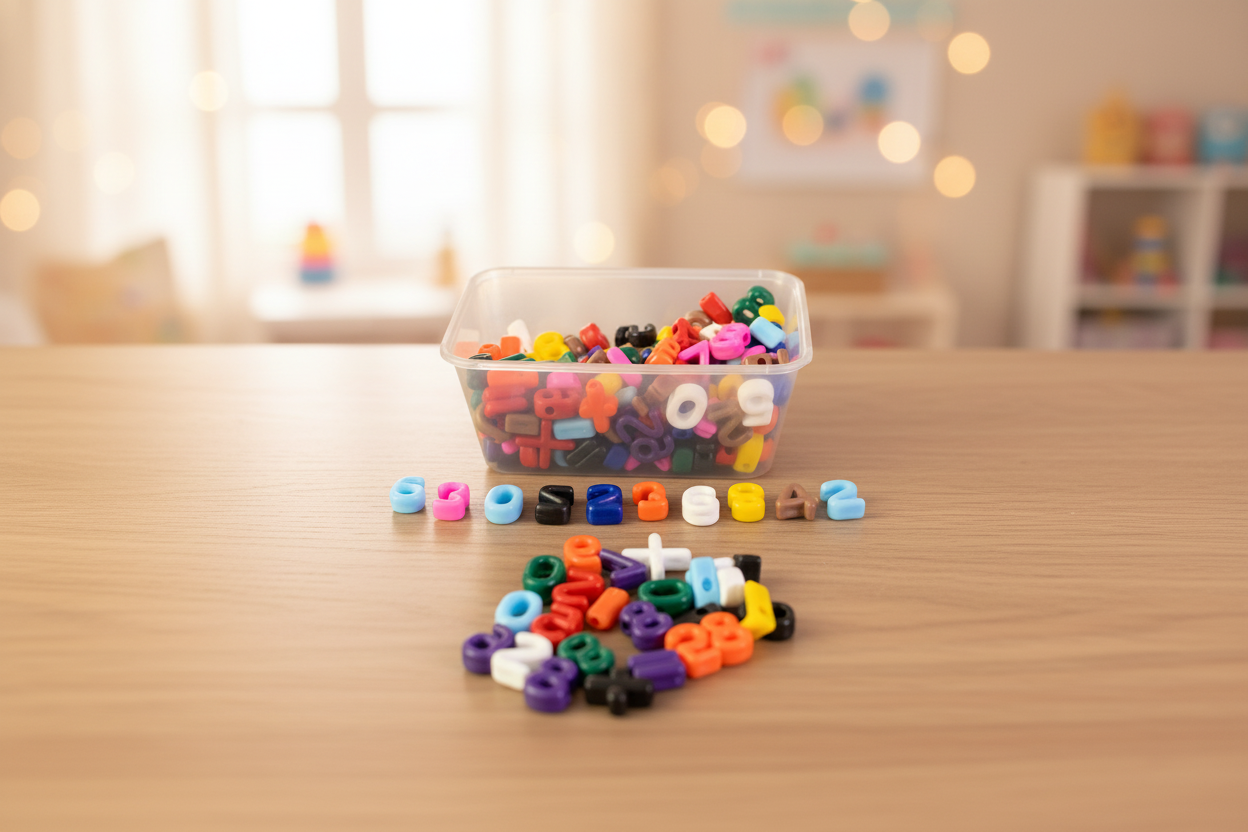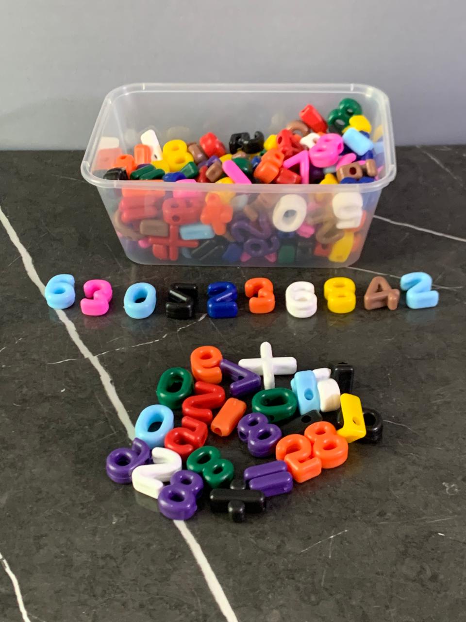 - Chunky, colorful plastic beads featuring numbers from 0-9 and basic math symbols.