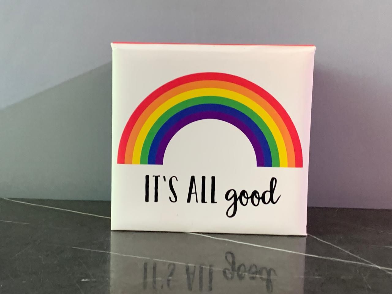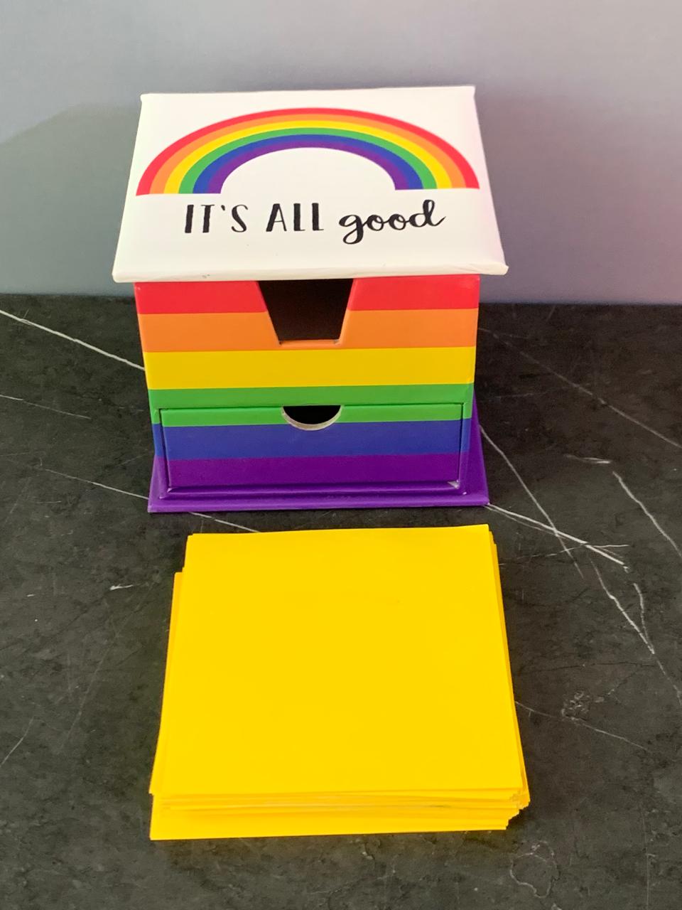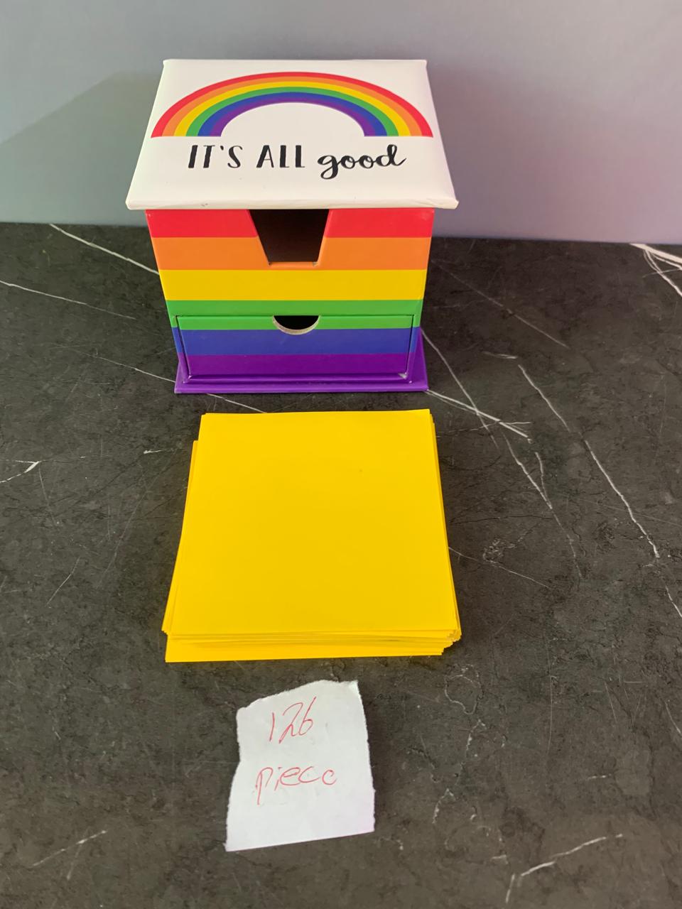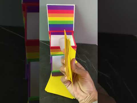 - A cube-shaped box with multiple rainbow-colored tiers.