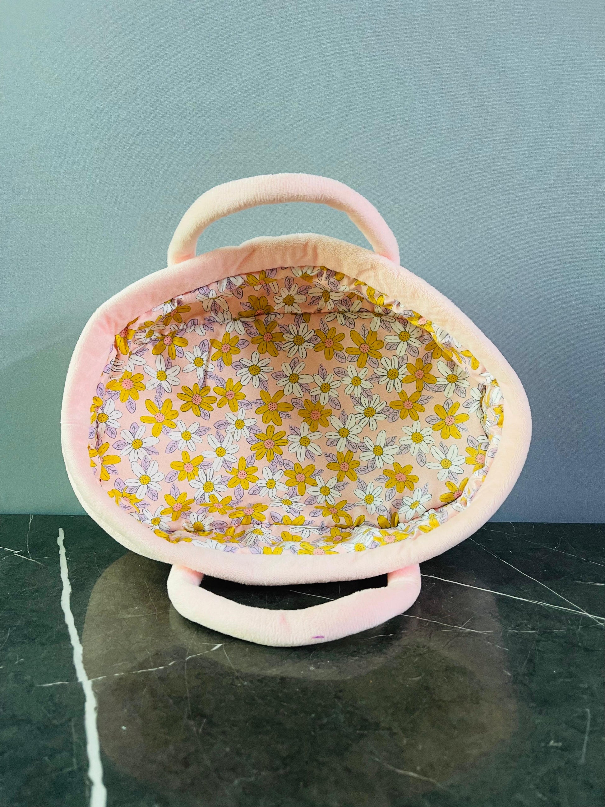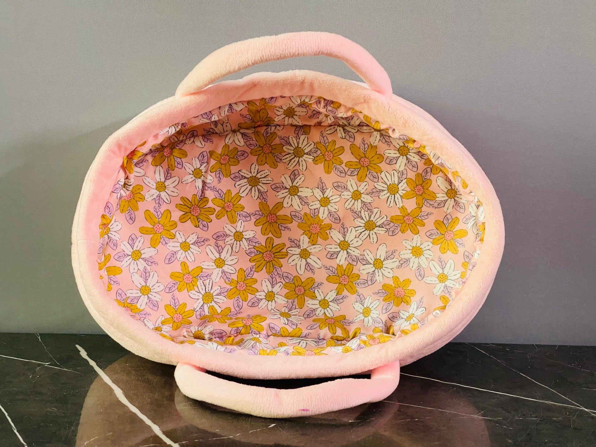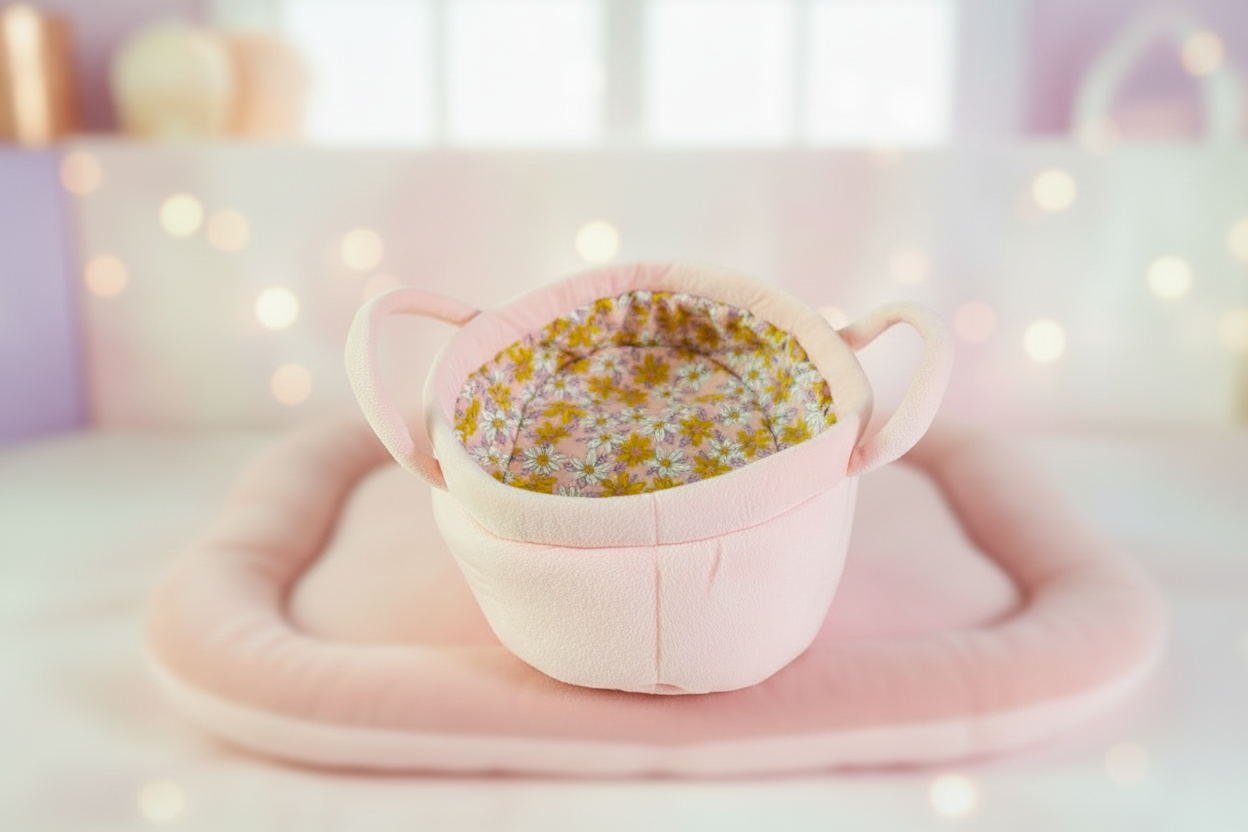 - The bassinet is made from soft, peach-colored fabric with a yellow floral-patterned lining.