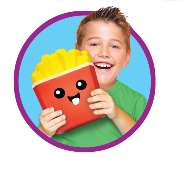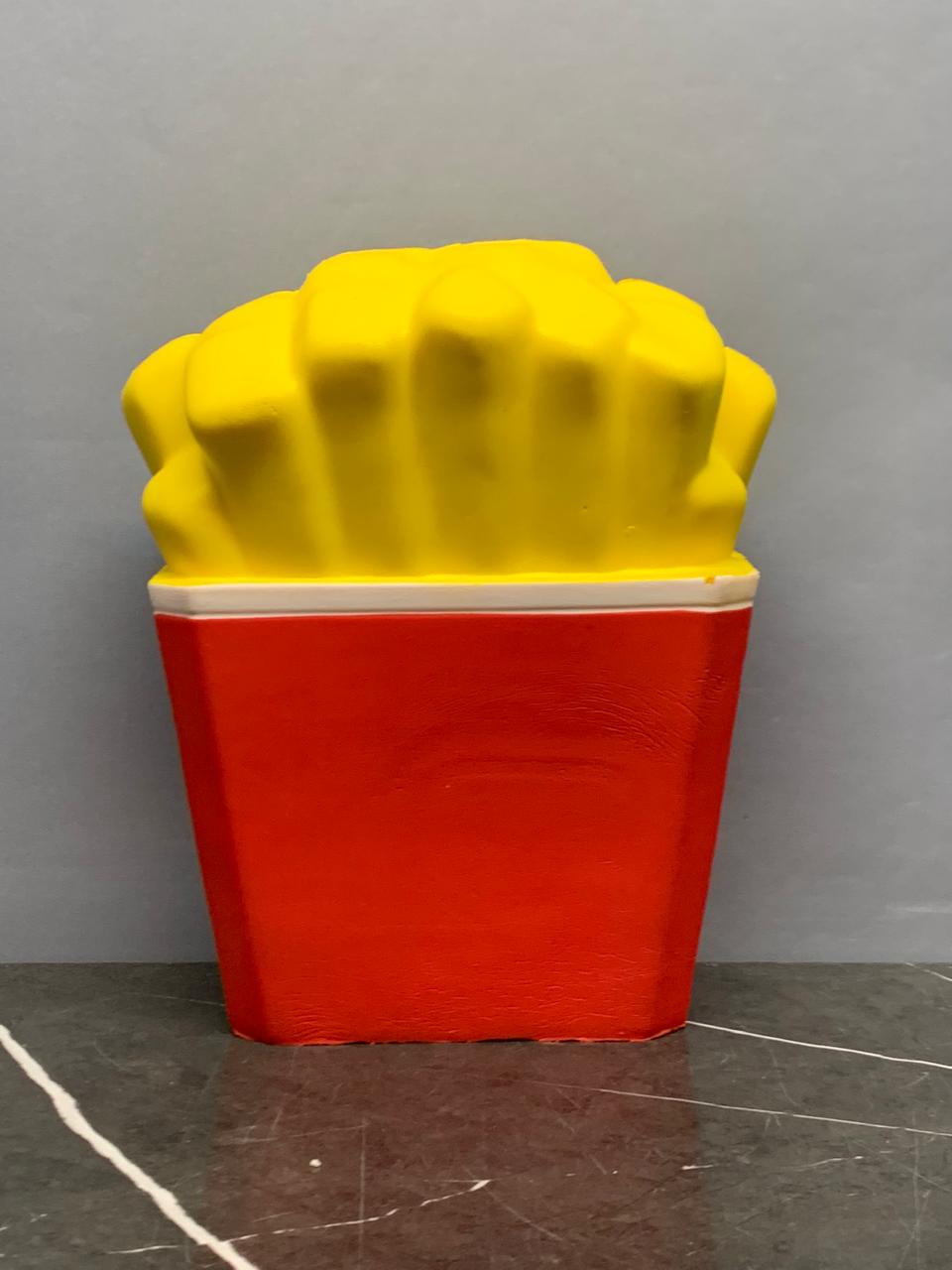 - Features a fun design with a smiling face on a red fries container and yellow fries.