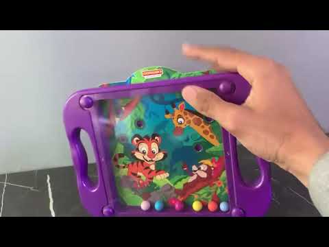 - The game includes several small plastic marbles that are moved by tilting and maneuvering the purple plastic frame.