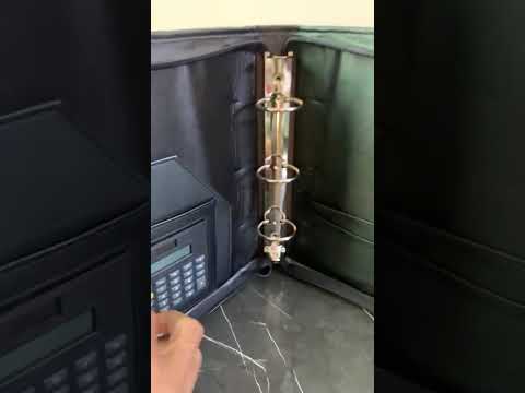 - Business binder or organizer, including a calculator, a pen loop, and pockets for papers.