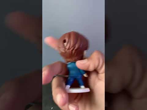 - The figure is designed in a chibi style with exaggerated features and wears a distinct blue suit.